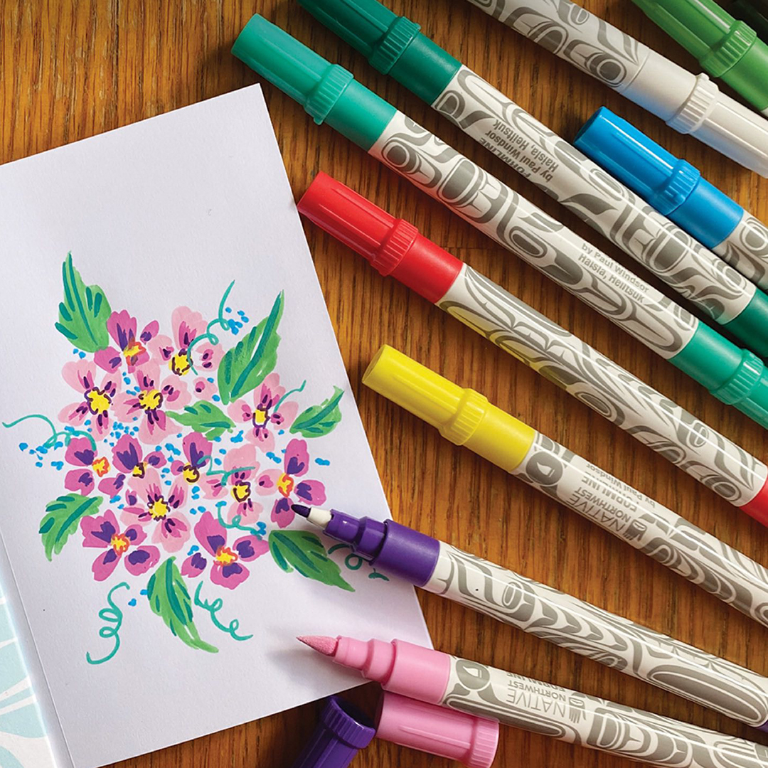 Bring creativity to life with this Native Northwest range of markers, colouring pencils and activity books. These dual-tip Acrylic Felt Markers feature a precise fine tip for detailed highlights and a flexible brush tip for smooth colouring and shading. Whether you’re crafting, illustrating, or lettering, the dual-tip design gives you endless creative options.