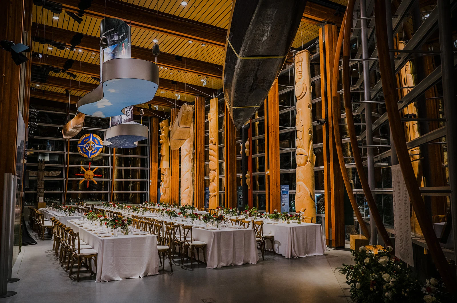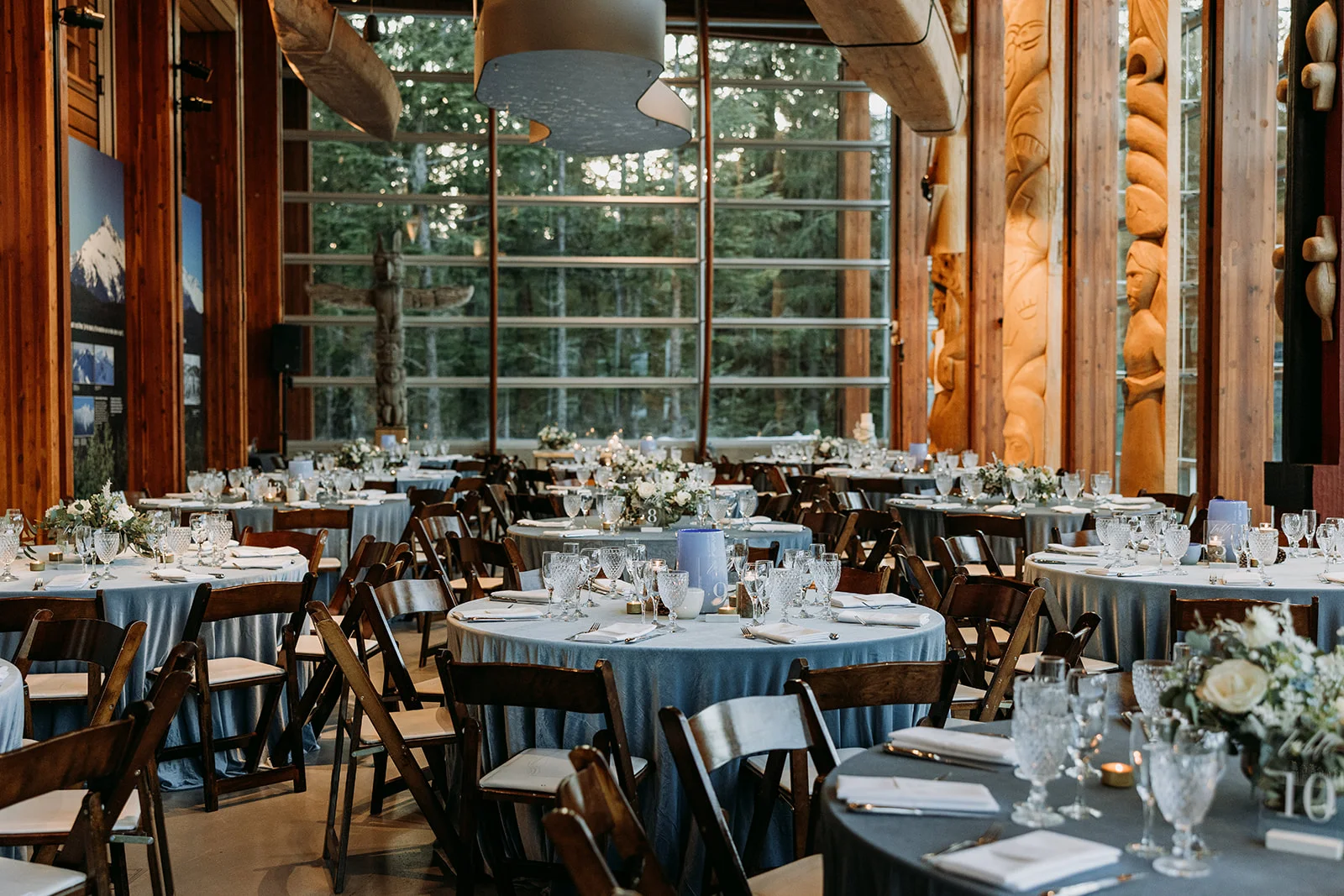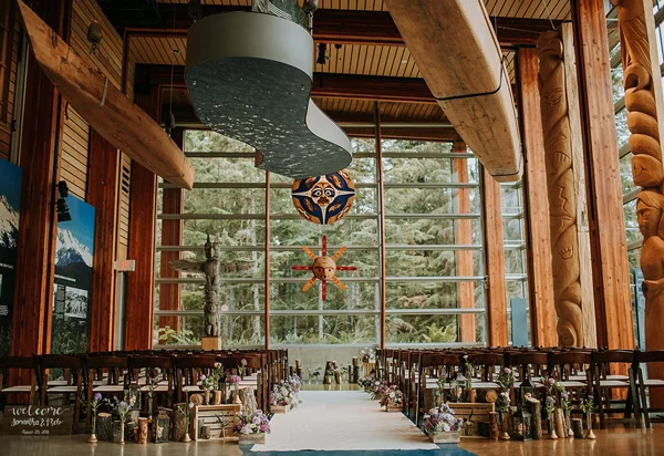 You can hold your wedding ceremony amongst the traditional carvings and suspended canoes and exhibits and under exhibits suspended in the Great Hall or dine on our covered mezzanine patio nestled along the Pacific Northwest forest while enjoying the spectacular views of the Blackcomb Mountain. Connect with us directly, or have your Wedding Planner in Whistler reach out about hosting your wedding at the Squamish Lil’wat Cultural Centre, a truly unforgettable experience in any of our versatile and unique spaces.